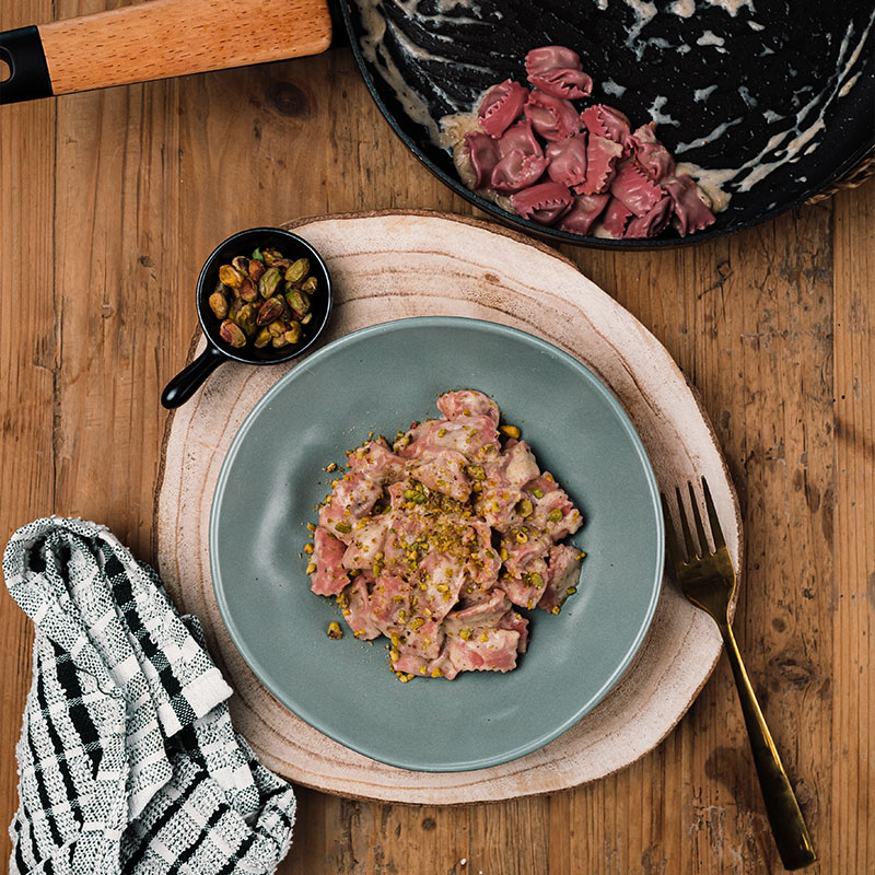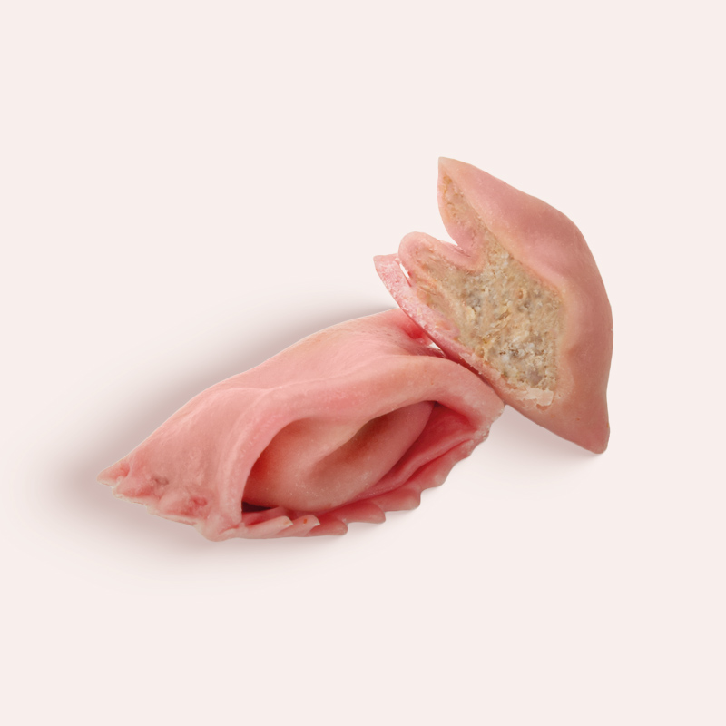 la pasta rossa è preparata con farina, semola di grano duro e uova fresche, che conferiscono un colore intenso e un sapore delicato. La pasta è tirata finissima, per racchiudere il ripieno con delicatezza, mantenendo la consistenza leggera e avvolgente.