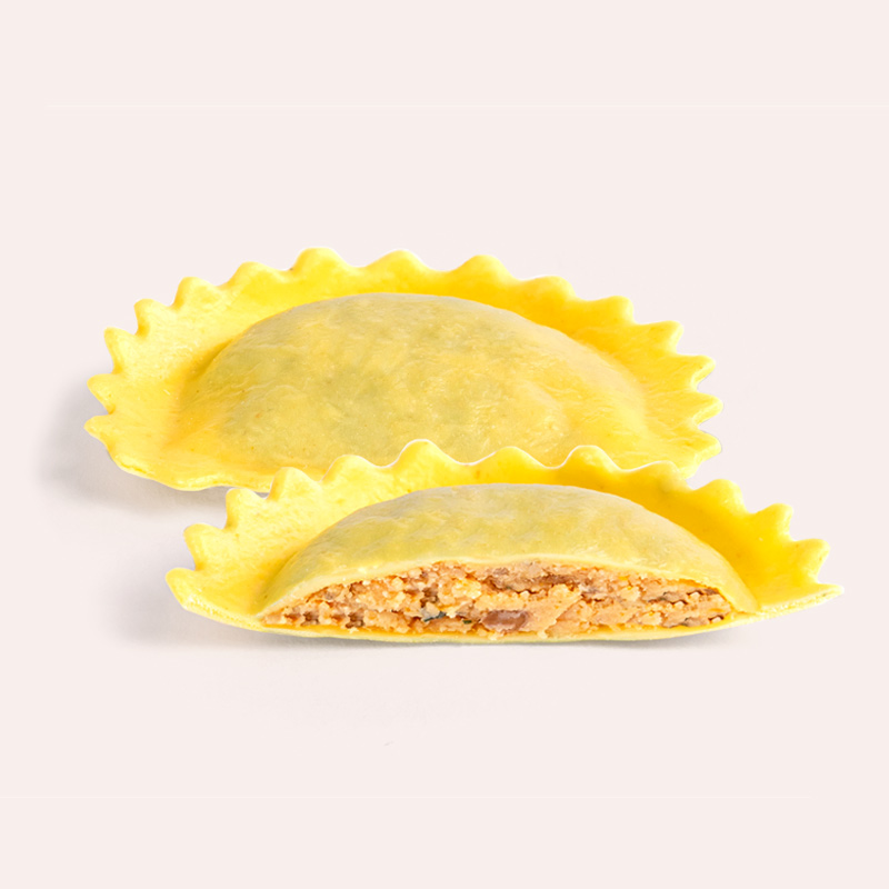 la pasta fresca all’uovo, preparata con semola di grano duro e uova fresche, è tirata sottilissima per racchiudere il ripieno in modo delicato e raffinato. La consistenza leggera e vellutata della pasta esalta la freschezza del pomodoro e della mozzarella, offrendo un contrasto perfetto che esplode in bocca con ogni morso.